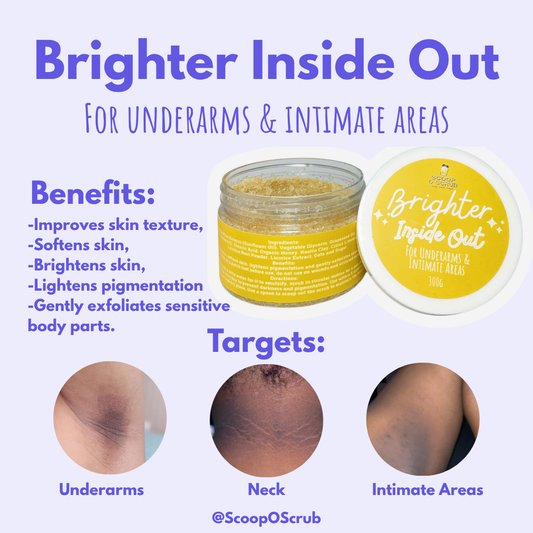 Introducing our improved best-selling scrub, now designed for underarms and intimate areas. Enhanced with glycerin, kaolin clay, and licorice root, this scrub is now 10x more effective. Its emulsifying formula ensures easy application, deep moisturization, and gentle care for your skin. With increased quantity, upgraded packaging, and superior quality, the new price tag is well worth it. A little product goes a long way.